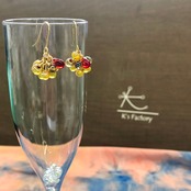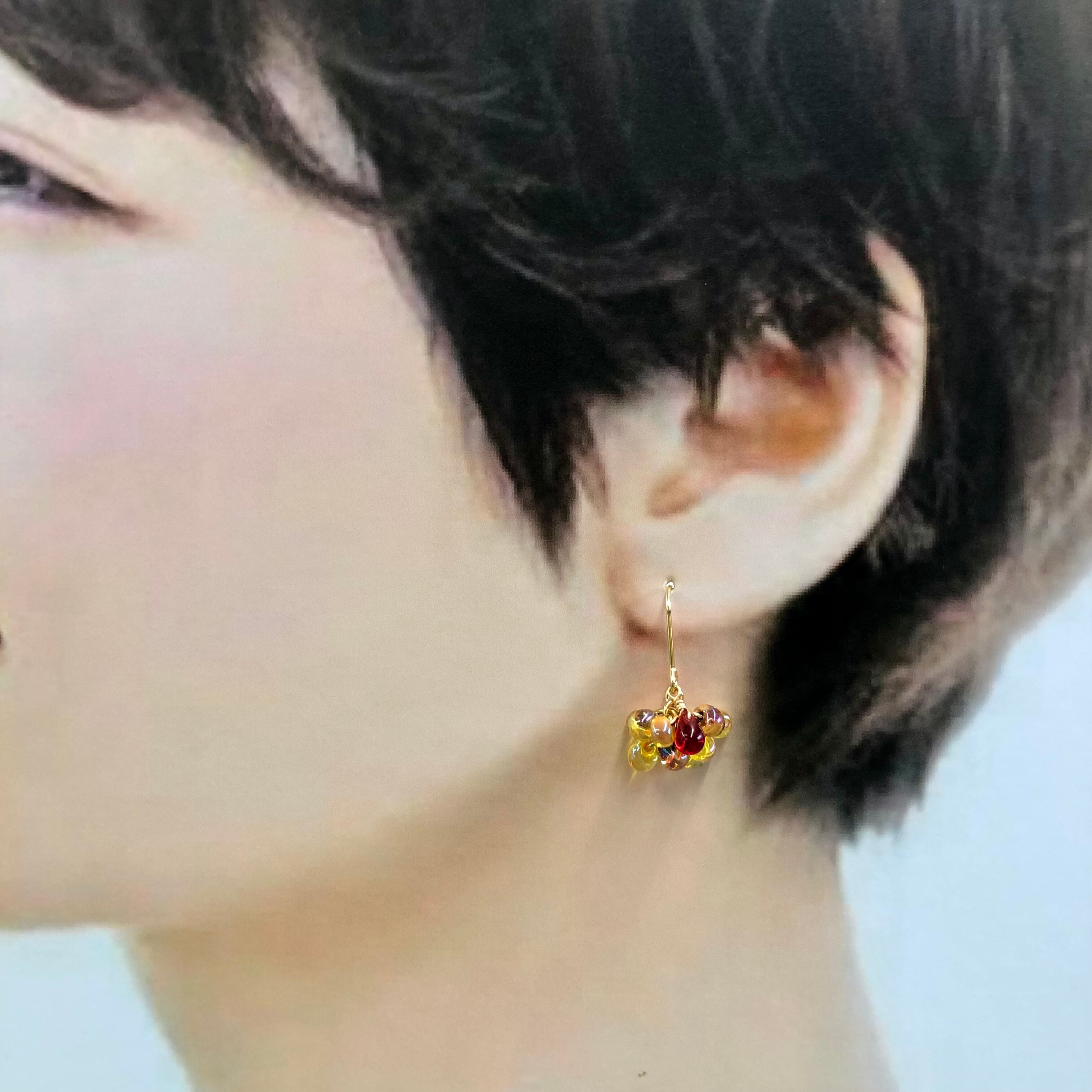 イエロー、オレンジ系のビーズを使い、赤でアクセントをつけて可愛らしいピアスに仕上げました。
