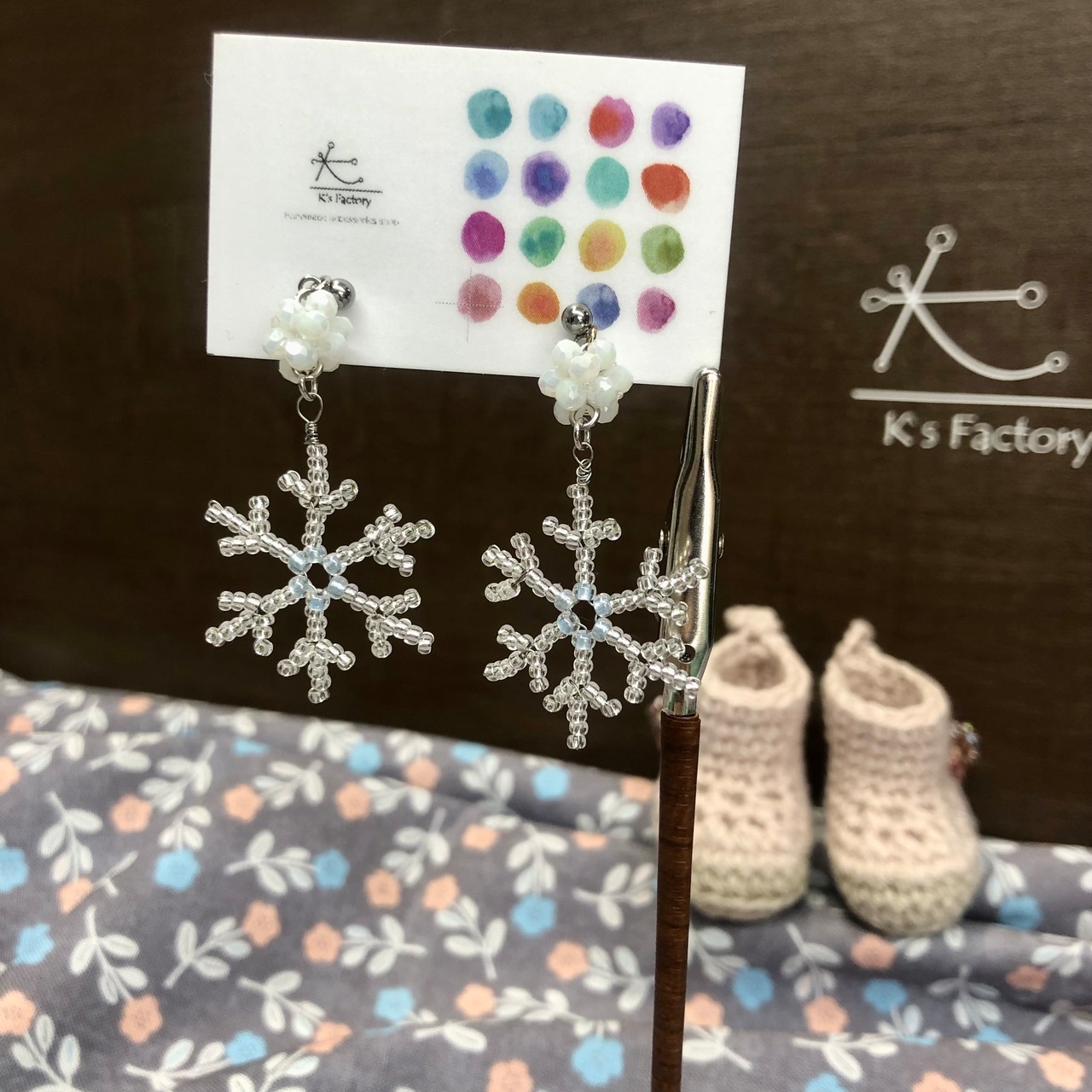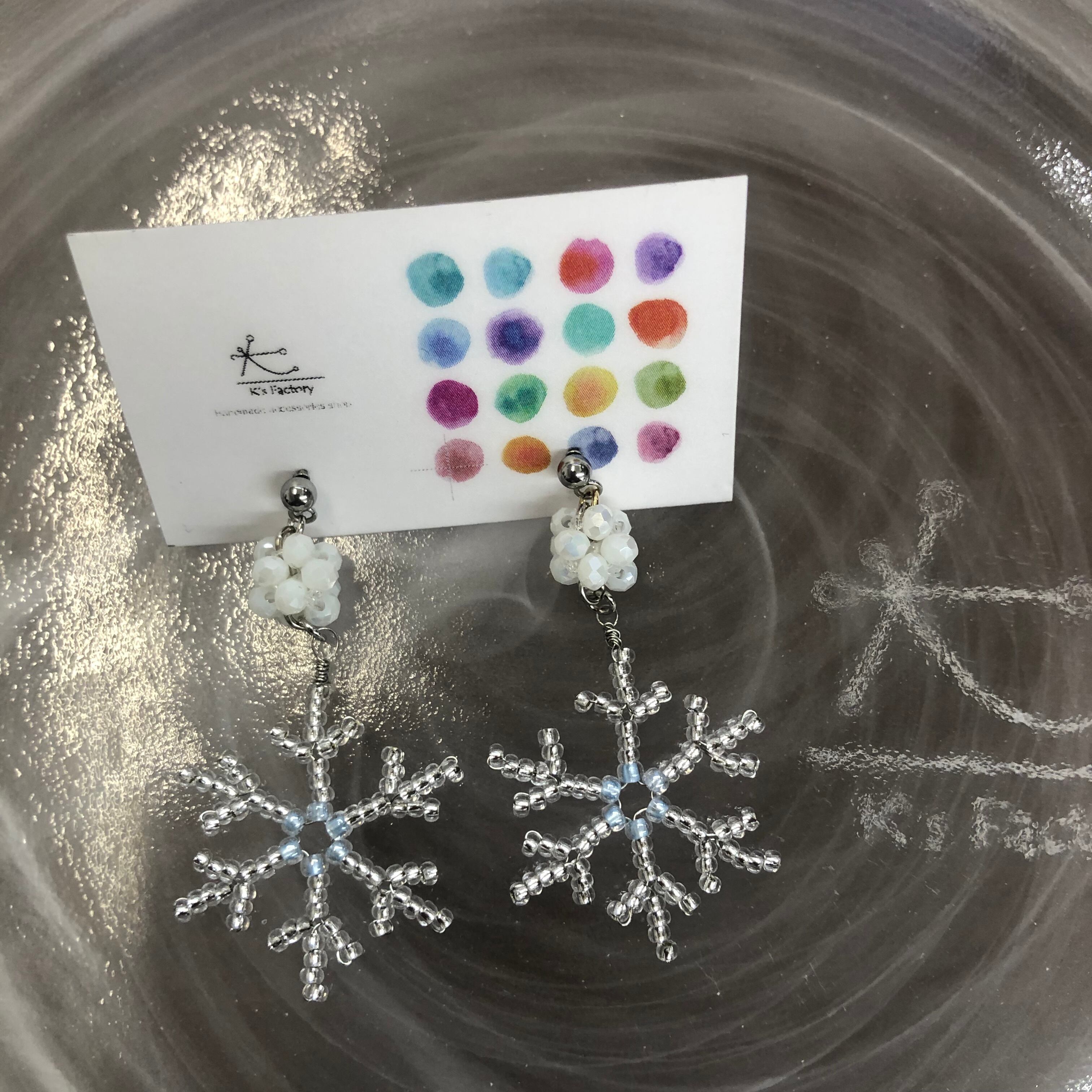 雪の結晶を極小のビーズでチャームをつくり、